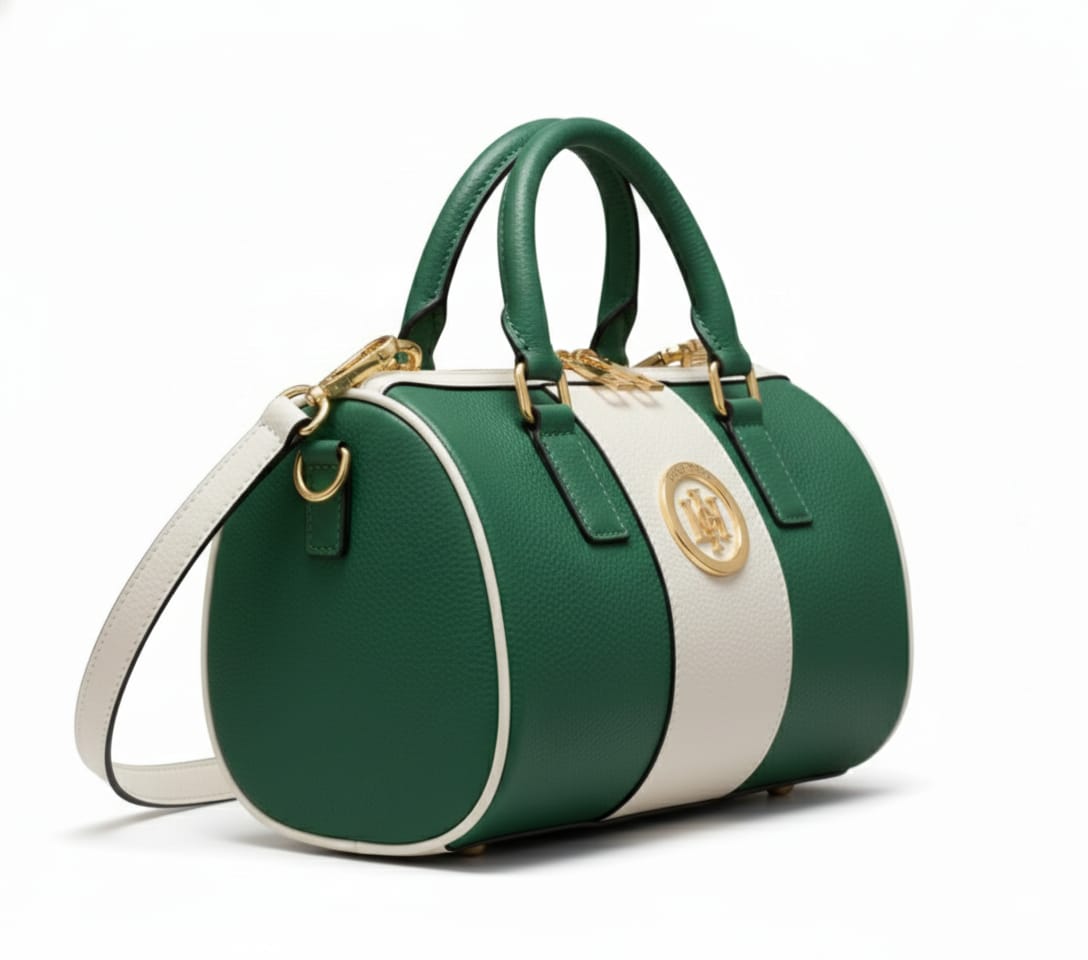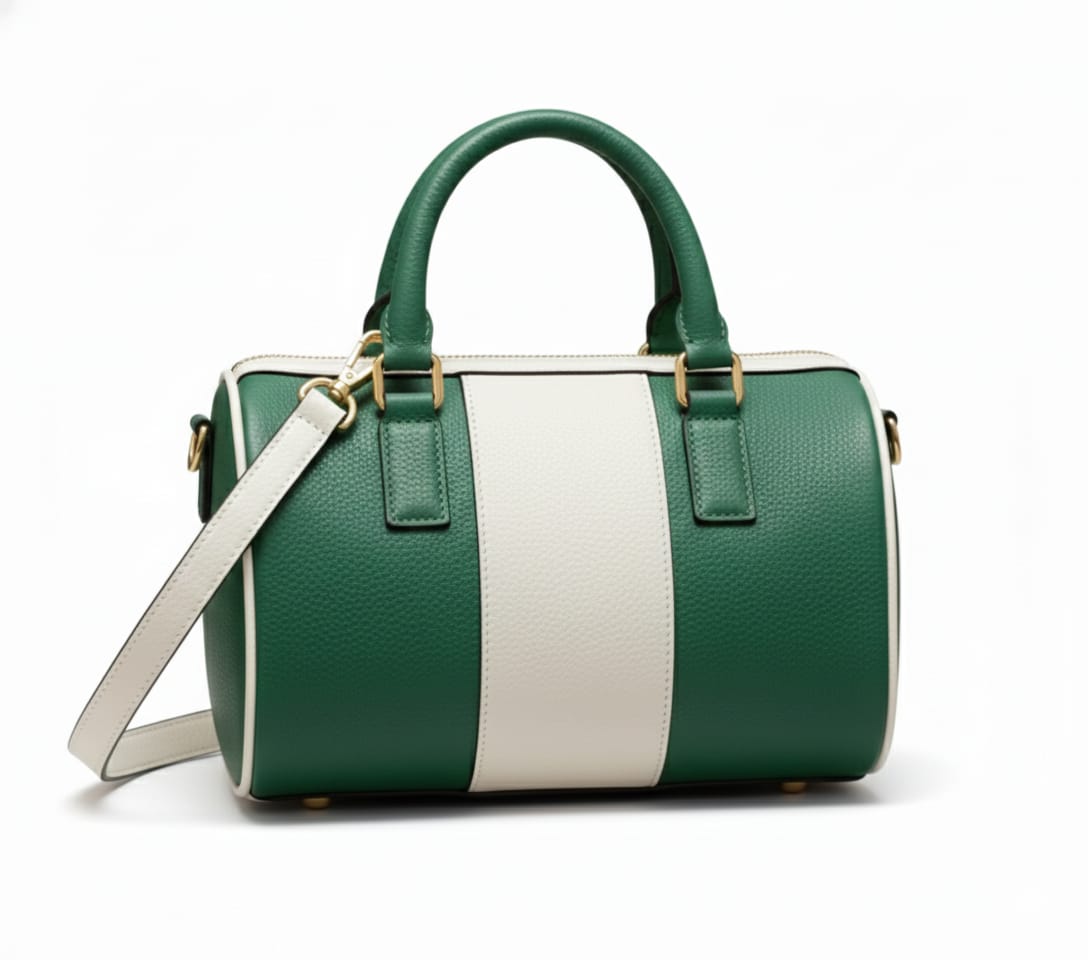 This vibrant Barrel Eco green and white Barrel-style offers a sporty yet luxurious aesthetic, featuring a bold tri-panel design and premium gold-tone accents.