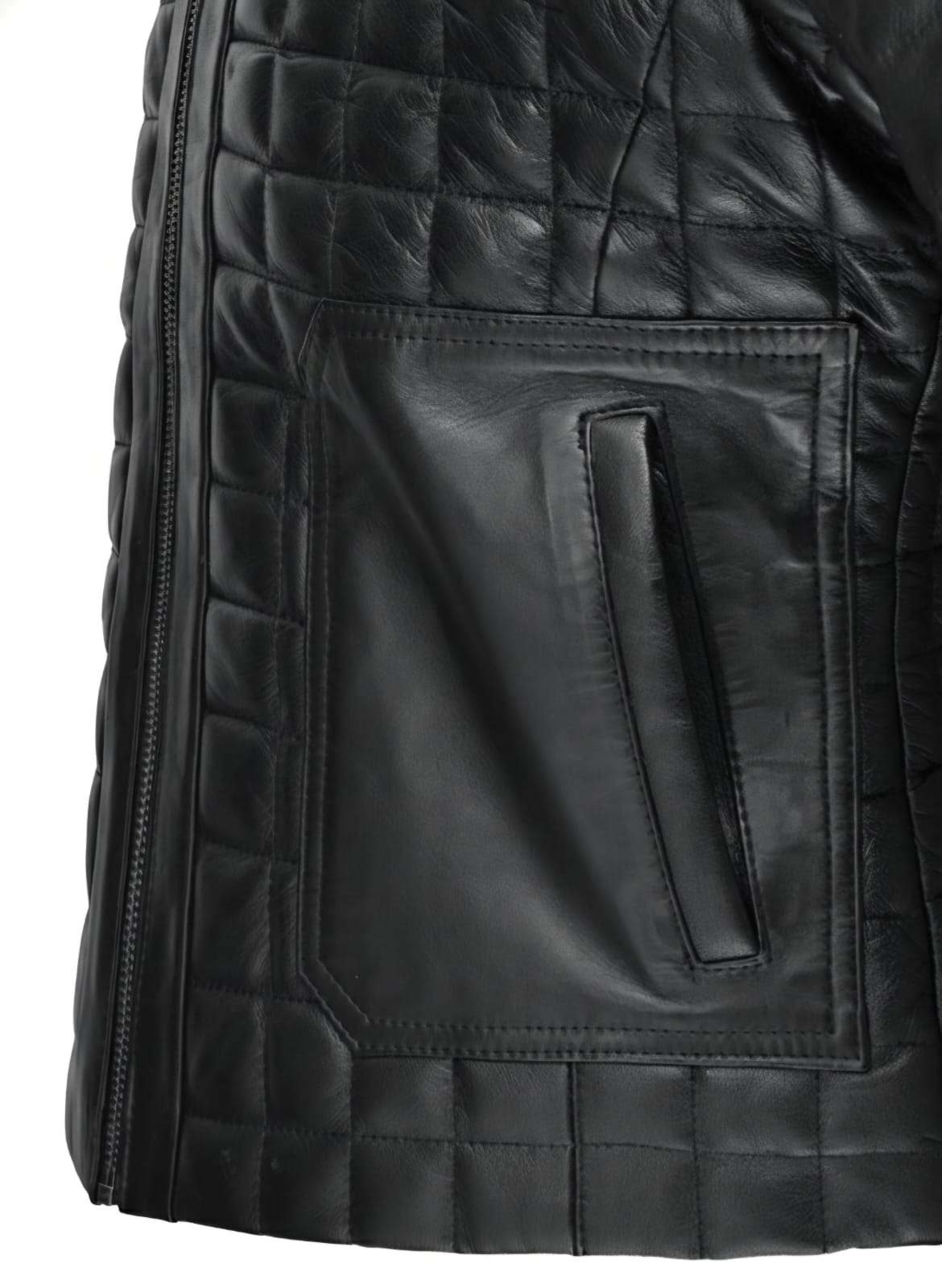 The meticulous stitching creates a geometric rhythm, catching the light with every move, while zippered cuffs add a subtle edge. This is more than a jacket, it’s wearable architecture for those who appreciate bold detail and refined structure.