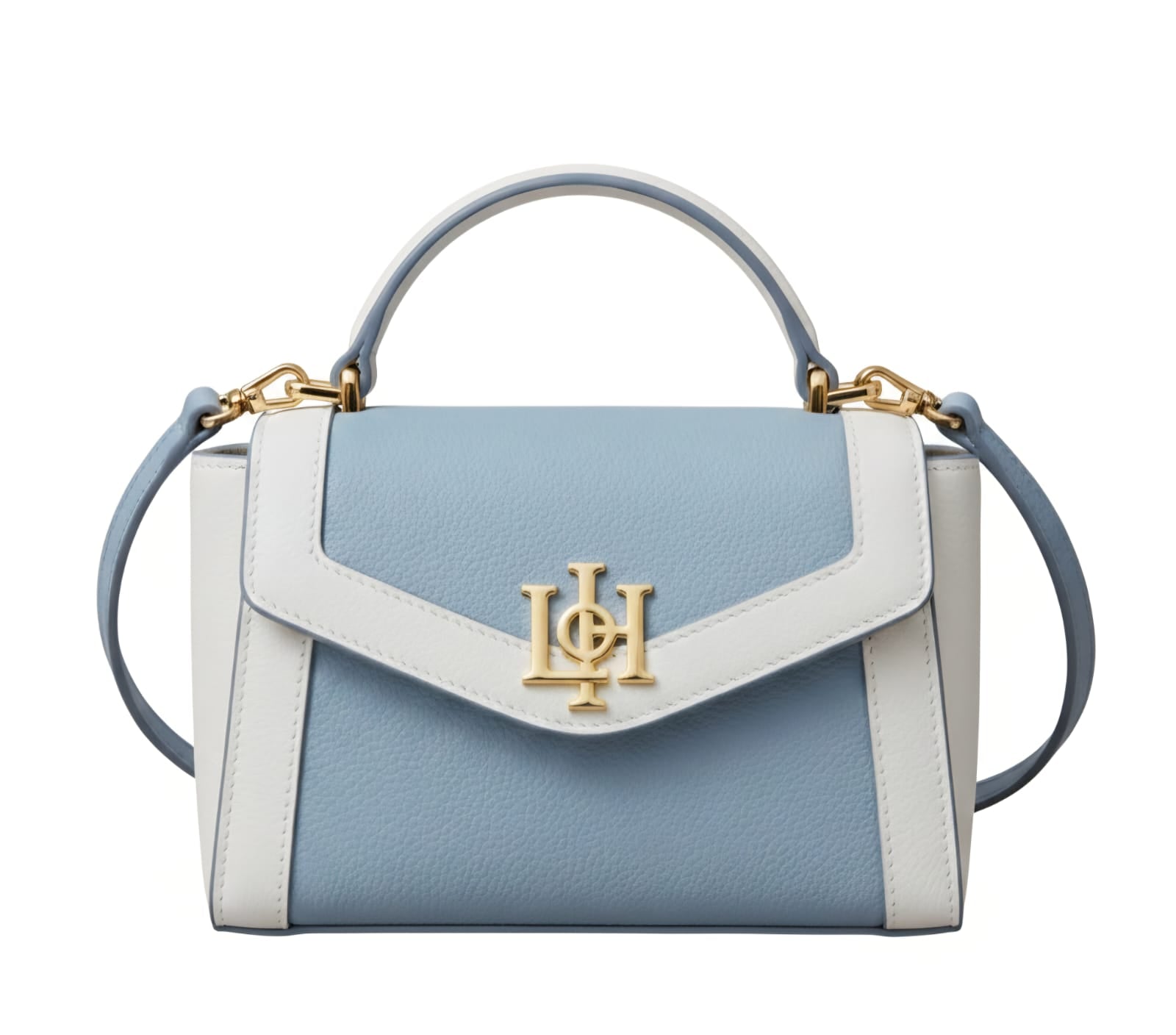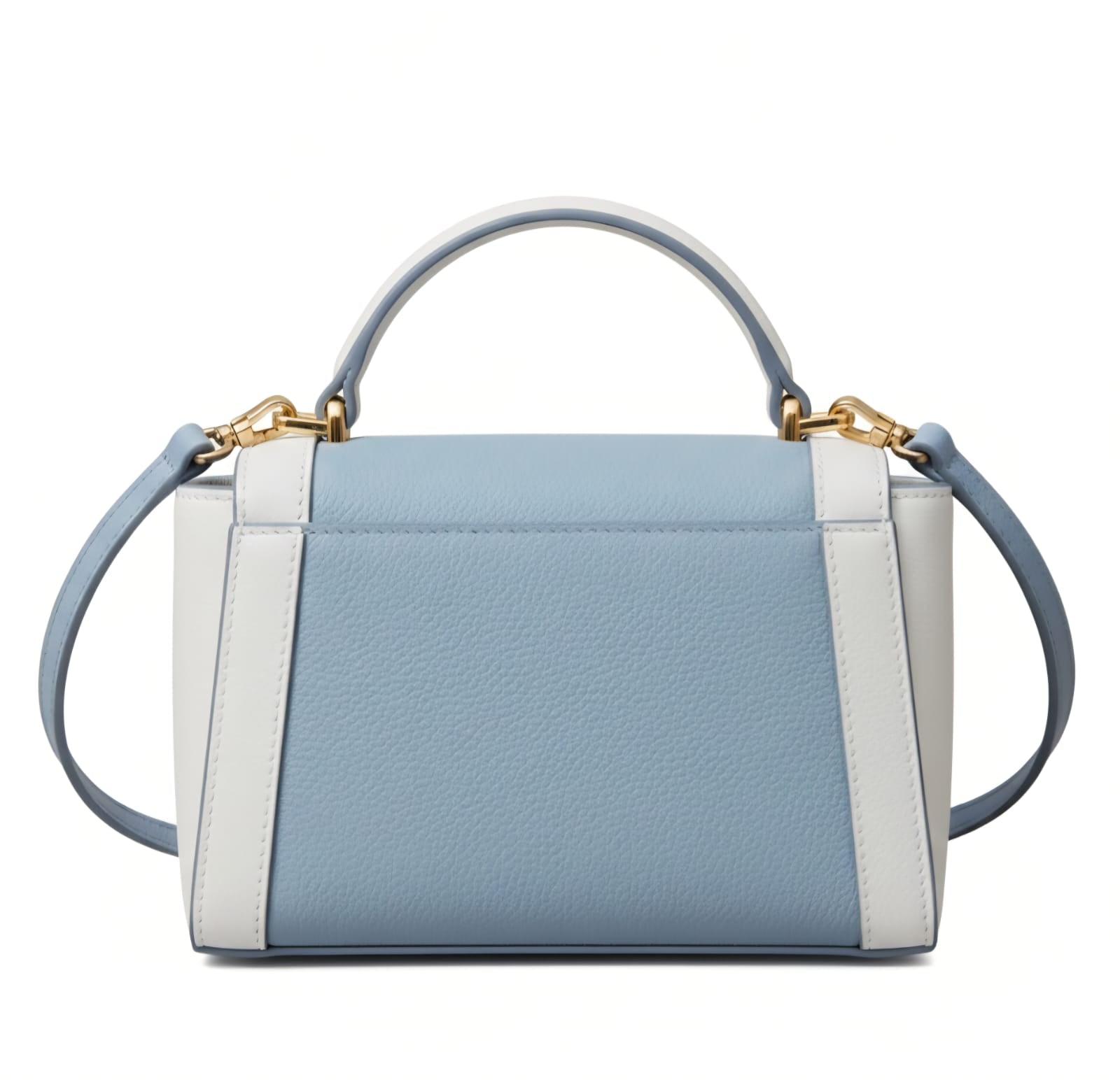 This chic dual-tone mini satchel blends a serene color palette with structured elegance, offering a fresh and modern take on a classic silhouette.
