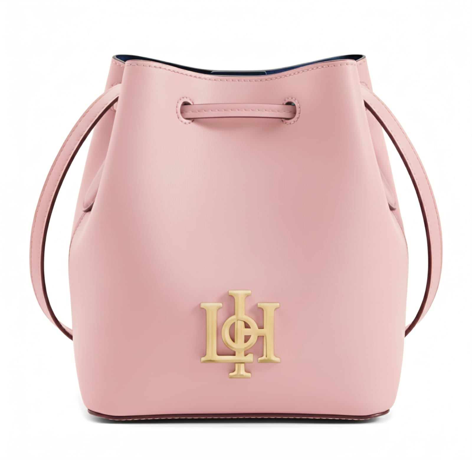 This charming Mini Bucket Bag offers a soft, youthful aesthetic with a clean design that emphasizes high-quality materials and distinctive branding.