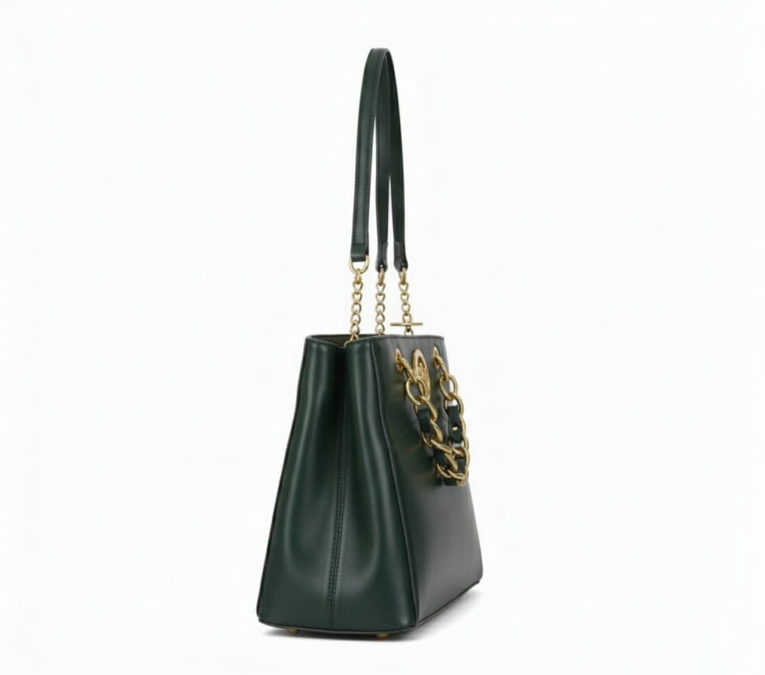 This sophisticated dark emerald tote bag offers a deep, rich aesthetic that highlights high-shine gold-tone detailing and smooth leather craftsmanship.